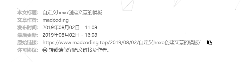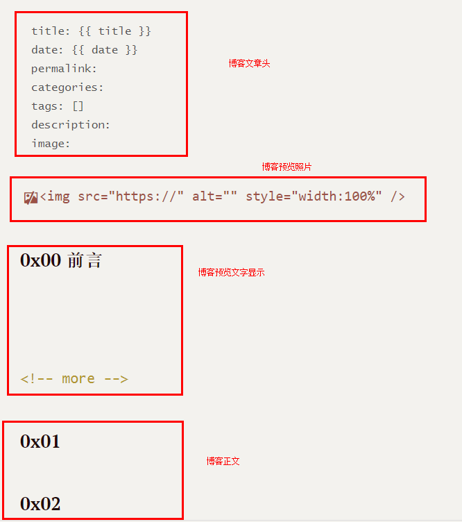 | ---- title: {{ title }} //文章标题 date: {{ date }} //文章创建时间 permalink: //文章显示连接 categories: //文章匪类目录 tags: [] //文章标签,可多个,用,隔开 description: //文章描述 image: //自定义的文章摘要图片,只在页面展示,文章内消失 copyright: true //增加底部的版权信息(需要配置) ----- //首页文章展示缩略图 <img src="https://" alt="" style="width:100%" />