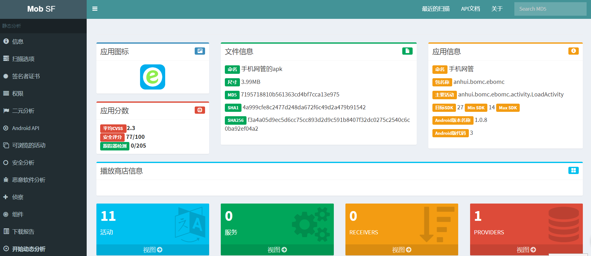 移动安全框架(MobSF)是一种自动化的一体化移动应用程序(Android /iOS /Windows)笔测试框架,能够执行静态,动态和恶意软件分析。它可用于Android,iOS和Windows移动应用程序的有效和快速安全分析,并支持二进制文件(APK,IPA和APPX)和压缩源代码。MobSF可以在运行时为Android应用程序进行动态应用程序测试,并具有由CapFuzz(一种特定于Web API的安全扫描程序)提供支持的Web API模糊测试功能。MobSF旨在使您的CI / CD或DevSecOps管道集成无缝。