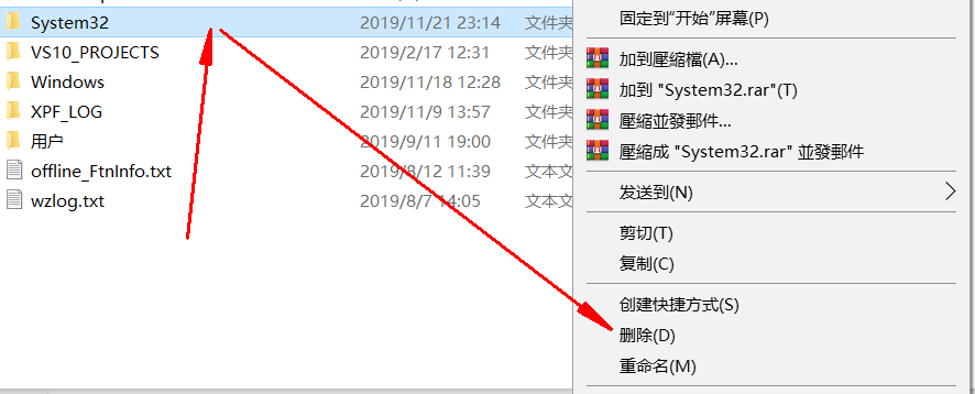 然后到C盘将system32这个目录直接删掉