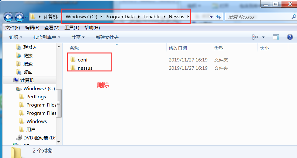 打开C:\ProgramData\Tenable\Nessus目录,删除已有的conf和nessus目录