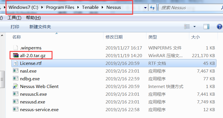 将下载好的插件包文件all-2.0.tar.gz拷贝到C:\Program Files\Tenable\Nessus目录下