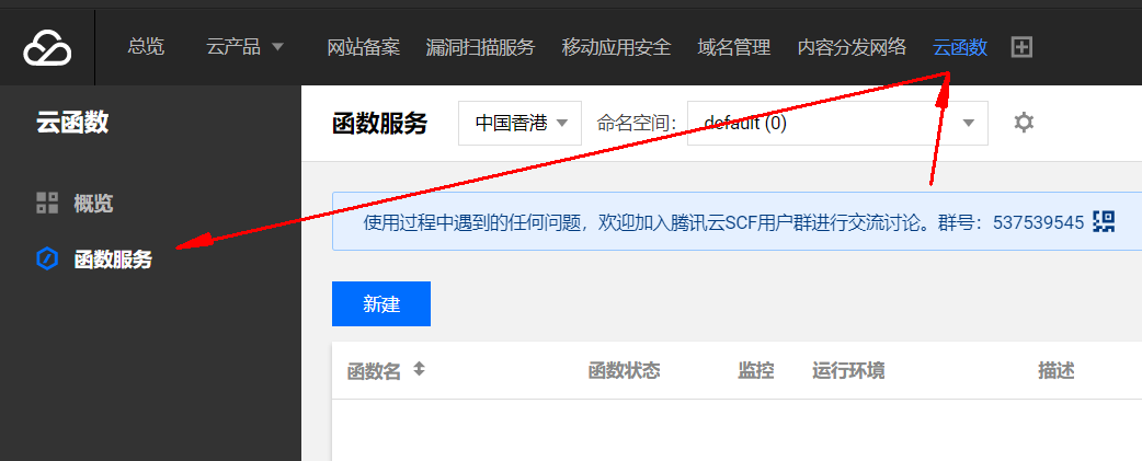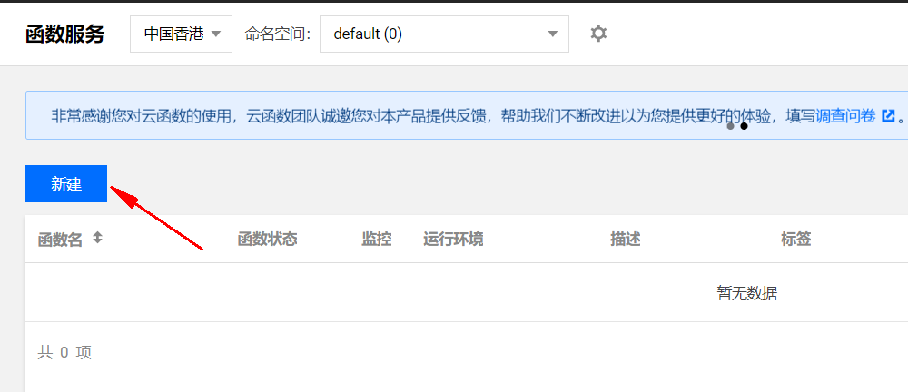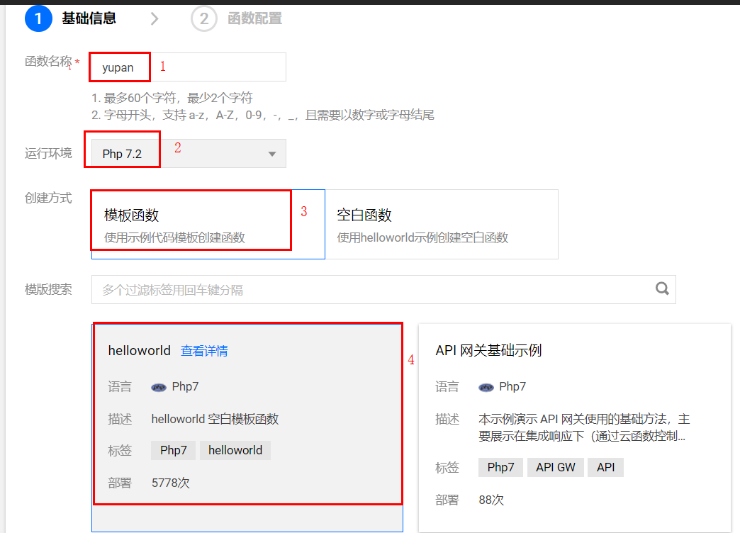 登录腾讯云函数平台后,新建一个云函数,地区选择香港或者新加坡地区。创建的云函数名称随便填写,运行的环境选择PHP7.2 ,创建方式选择模板函数;模板选择helloword模板,下一步直接完成。