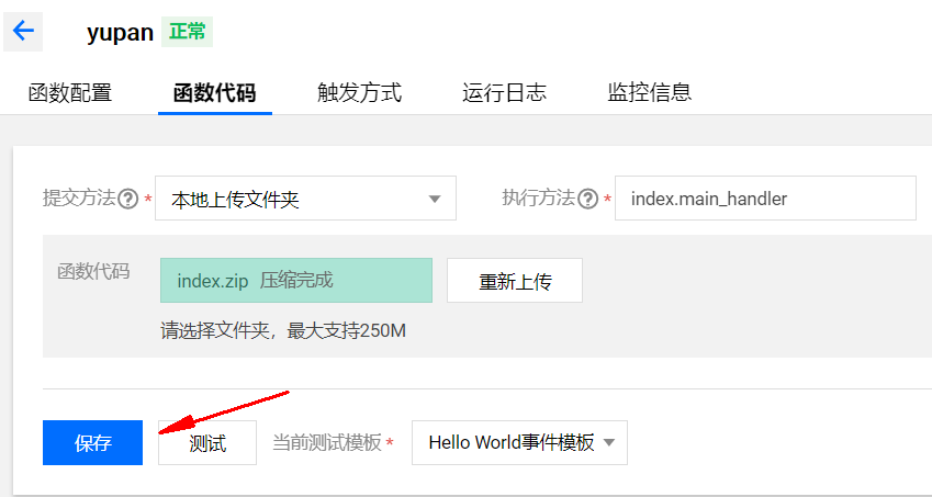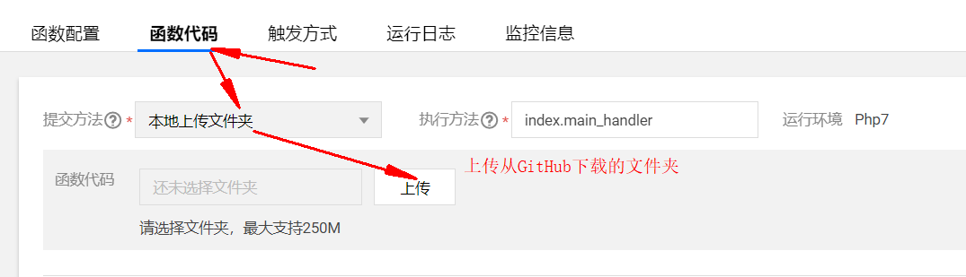 从GitHub下载OneDrive_SCF源码,进入函数服务选择函数代码,提交代码选择本地上传文件夹,上传刚才解压的文件夹(注意:如果解压了双层文件夹需要点入第二个文件夹)