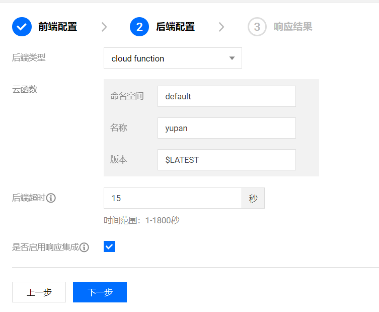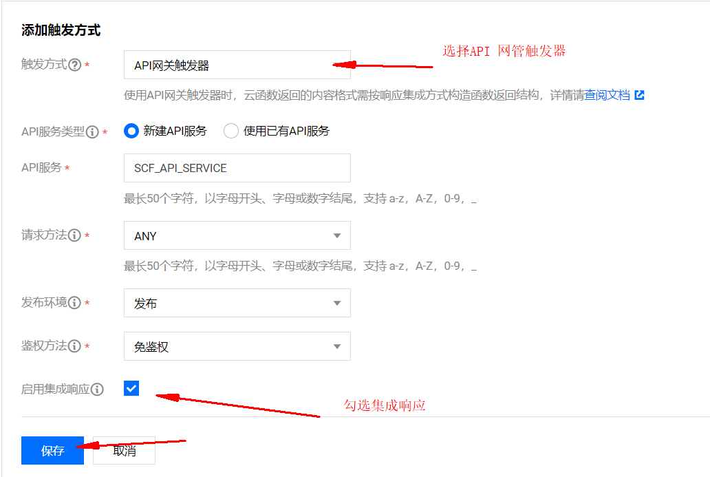 选择API网关触发器,勾选启用集成响应,然后点击保存。