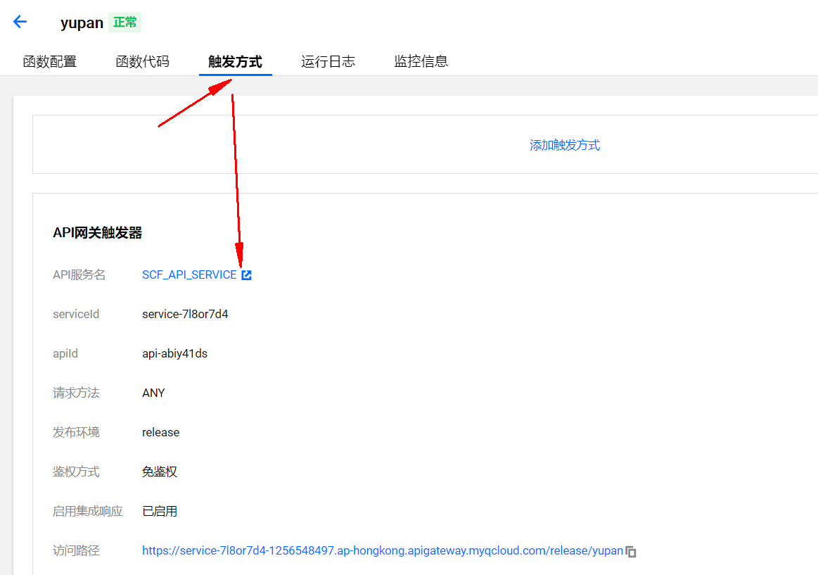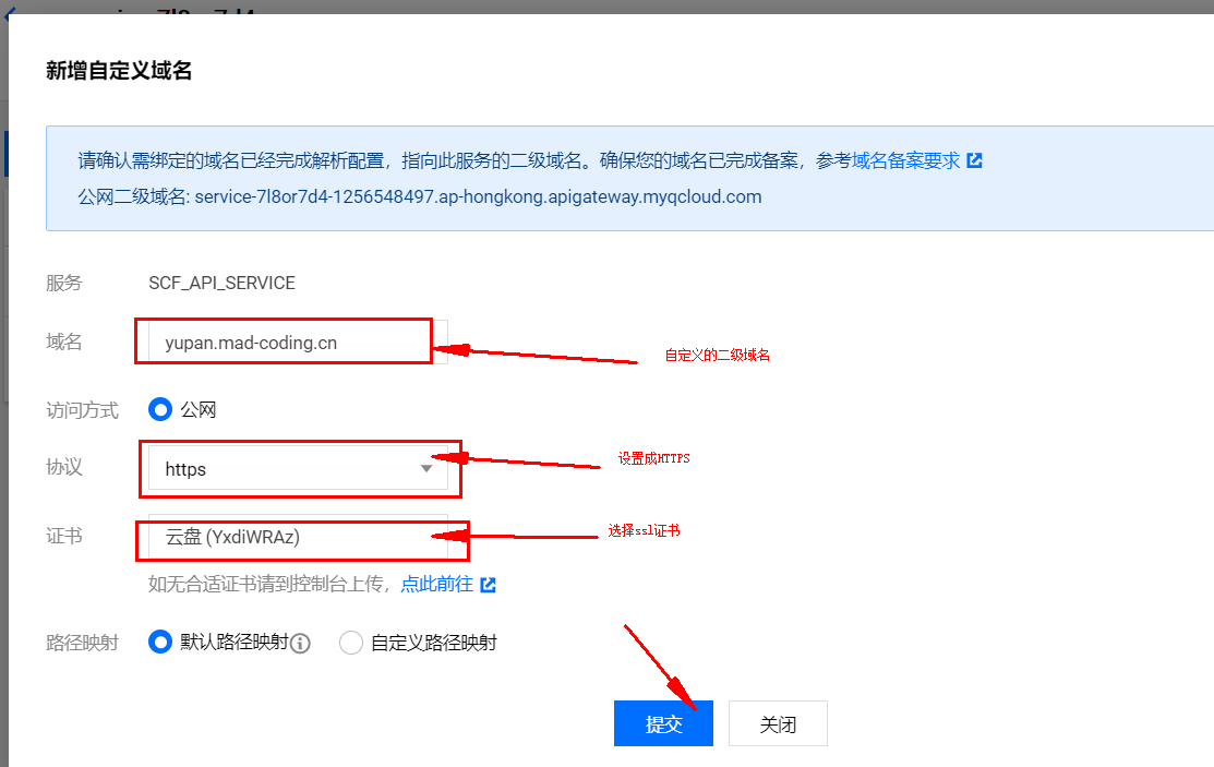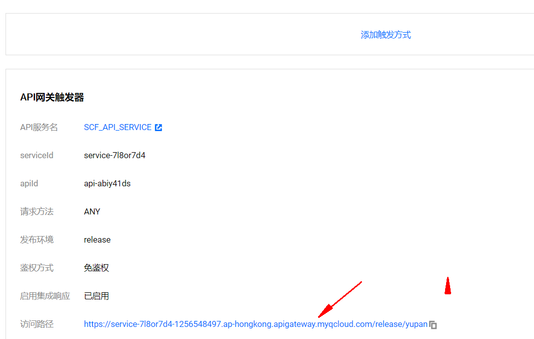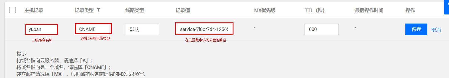在域名厂商设置域名解析,我域名是在腾讯买的,所以直接到域名解析出添加一个域名解析记录,主机记录就是二级域名,记录类型是CNAME(域名指向域名),记录值填触发方式中的访问路径。