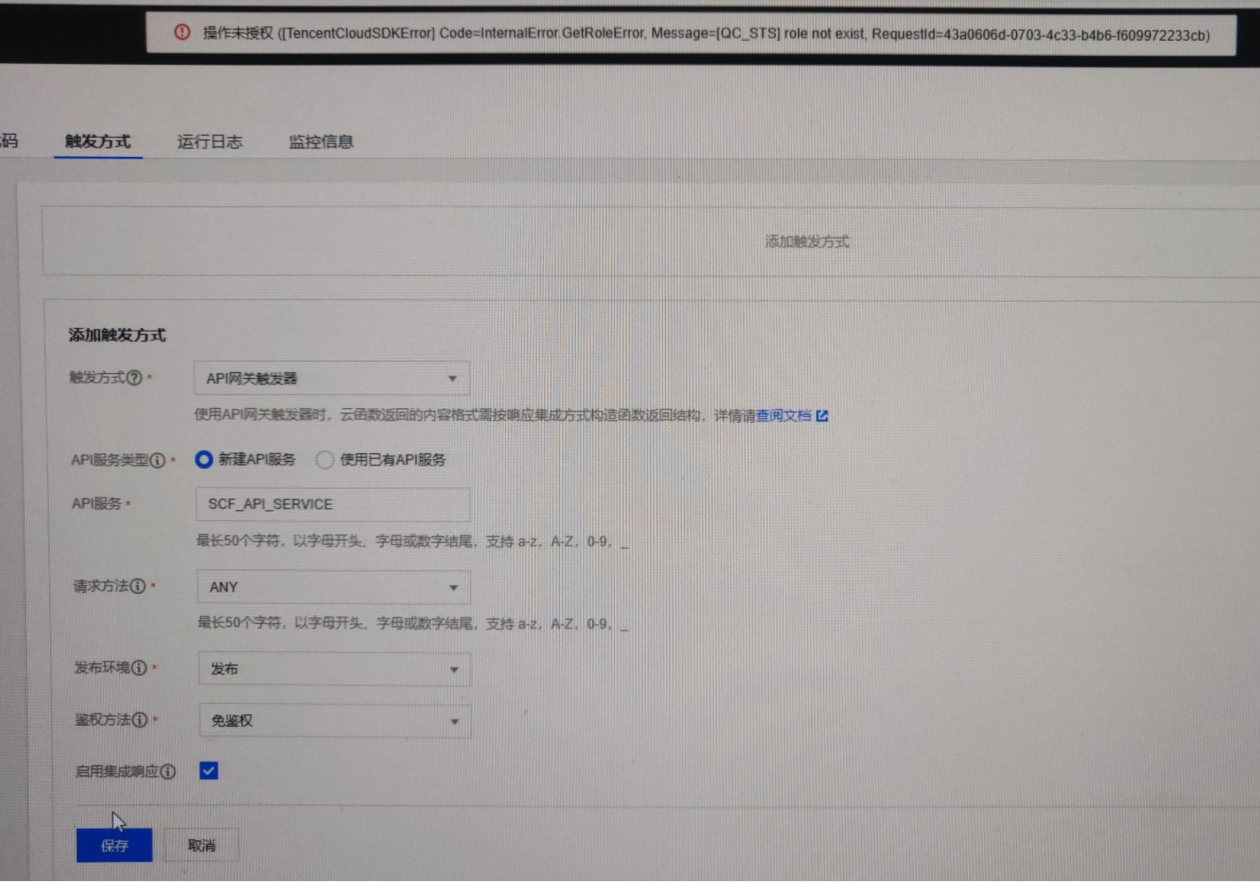 在创建API网管触发器的时候,出现操作未授权的错误,和教程不一样,网上也搜不到相关的信息。