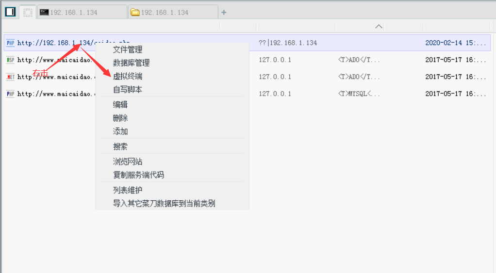 然后使用带后门的菜刀连接shell,连接虚拟终端执行命令