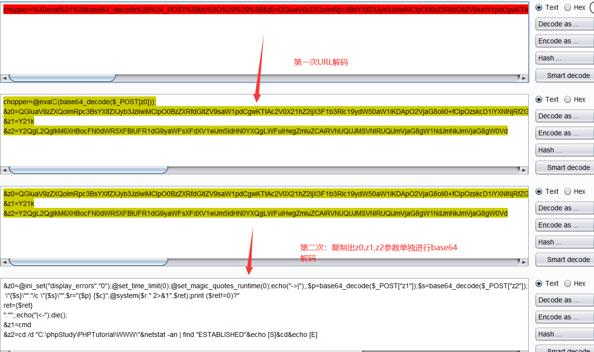 后面一部分是熟悉的菜刀的代码,但前面为什么居然还有一段加密的呢,接着解,解出来的结果