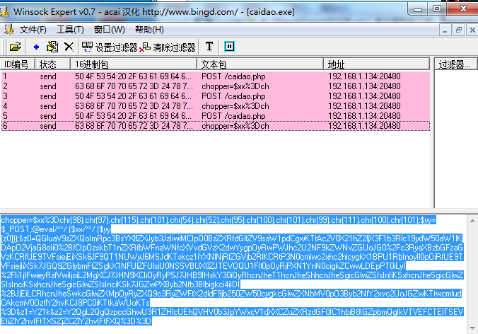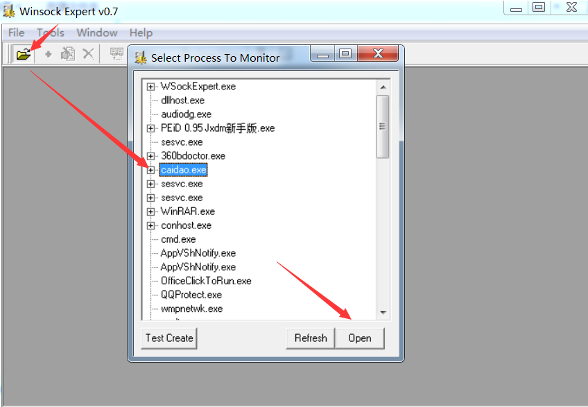 打开菜刀,启动抓包软件WSockExpert,点击左上角的文件夹图标,选择caidao.exe,点击open即可