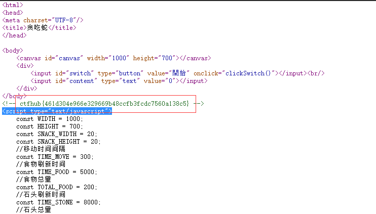 打开链接发现是贪吃蛇界面,而题目考的是响应包源代码,想一下一般响应包都是网页源代码,所以这里是不是找查看源代码尼?