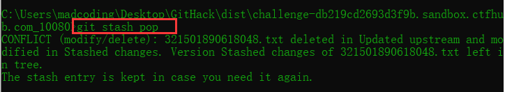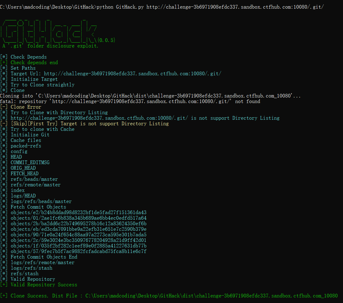lijiejie的GitHack,git下来的源码没有.git文件夹,所以git log查看版本等命令都用不了,一开始我以为是环境出了问题,后来看到官方的writeup中使用的工具不是lijiejie的,所以在github中找了BugScanTeam的工具进行使用